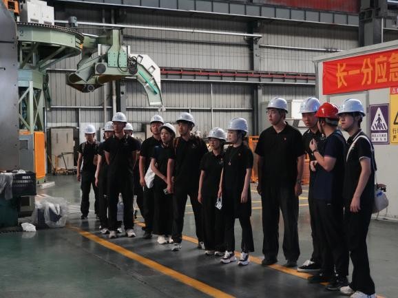 实践团首站走进海亮股份第二园区。在企业生产线上,成员们实地了解到海亮集团在技术创新、质量管控及绿色智能制造领域的扎实布局,直观感受到企业雄厚的科技实力与先进的生产管理水平。随后,实践团参观海亮党建厅,系统学习集团党建工作经验——海亮集团将党建工作与企业发展深度绑定,以党建为引领凝聚员工合力,为企业高质量发展注入强劲动力。